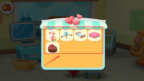3、使用紅框標注的商店界面,選擇箭頭指向的蛋糕等道具進行購買。